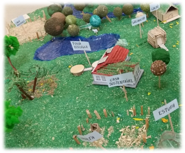 Uma vez definido o escopo da maquete, partiu-se para a implementação do projeto. Nesse momento, foram realizados estudos e pesquisas nas disciplinas ministradas na escola, as quais versaram sobre temas como: formas de energia, possibilidades de reaproveitamento do espaço e de todo o material produzido em uma propriedade rural, tratamento de resíduos, agroflorestas, coleta de água da chuva, telhado verde, fossa ecológica, produção e geração de rendas alternativas em pequenas propriedades rurais, compostagem, problemas ambientais e sociais, reciclagem, dentre outros elementos que constituíram a maquete.