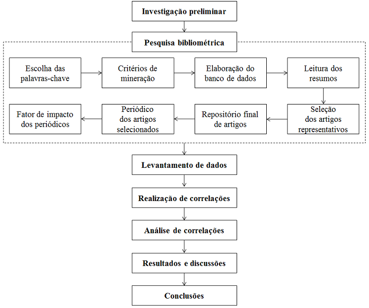 Esta seção descreve as variáveis e o método utilizados na análise, a fim de embasar quantitativamente o estudo. Esta pesquisa empírica classifica-se como correlacional (levantamento), pois sumariza resultados expressando relação entre duas variáveis (ROVINE; EYE, 1997), reconhecendo a linearidade intrínseca a tal método. Além disso, conforme Rovine e Eye (1997), os componentes correlacionados devem ter uma estrutura combinatória conhecida com clareza pelos pesquisadores que deles se utilizam, conforme foi explicado nas seções anteriores. Assim, para o delineamento deste estudo foram realizadas diversas etapas com o propósito de alcance dos resultados, ilustradas na Figura 1.