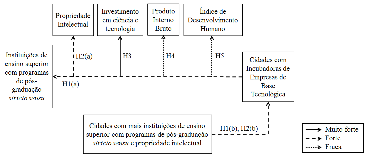 A Figura 2 sumariza as cinco hipóteses da pesquisa, indicando a existência de correlação e suas intensidades, em uma legenda que obedece à seguinte escala: linha pontilhada indica correlação fraca ou desprezível, linha tracejada significa correlação forte e linha contínua representa correlação muito forte.