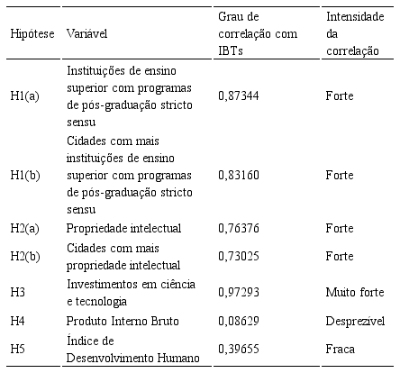 Na primeira hipótese, H1(a), o grau de correlação encontrado foi de valor 0,87344, indicando uma relação de forte intensidade entre a existência de incubadoras de empresas de base tecnológica e de instituições de ensino superior com programas de pós-graduação stricto sensu. Isso quer dizer que, nas cidades que possuem IBTs, há um alto grau de assertividade na consideração de que existem instituições de ensino superior com as características selecionadas.