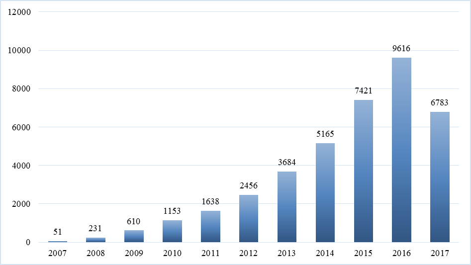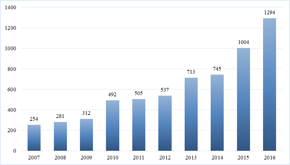 A consulta realizada na base Web of Science resultou em um levantamento de 9.957 publicações que relacionam os tópicos ‘desenvolvimento sustentável’ e ‘urbano’. Ao longo do período de dez anos, a produção científica associada a estas temáticas apresentou um crescimento significativo, passando de 254 publicações no ano de 2007, para 1.294 estudos em 2016, conforme apresentado na Figura 1. Nesse período, pode-se destacar a produção científica do ano de 2015, que apresentou um crescimento significativo, comparado ao ano anterior.