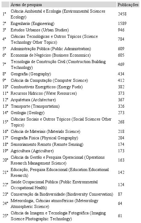 A fim de verificar a abrangência do tema analisado, são expostas as áreas de pesquisa das publicações relacionadas com os termos ‘desenvolvimento sustentável’ e ‘urbano’. A Tabela 9 apresenta as 25 áreas em destaque nos resultados obtidos neste levantamento.
