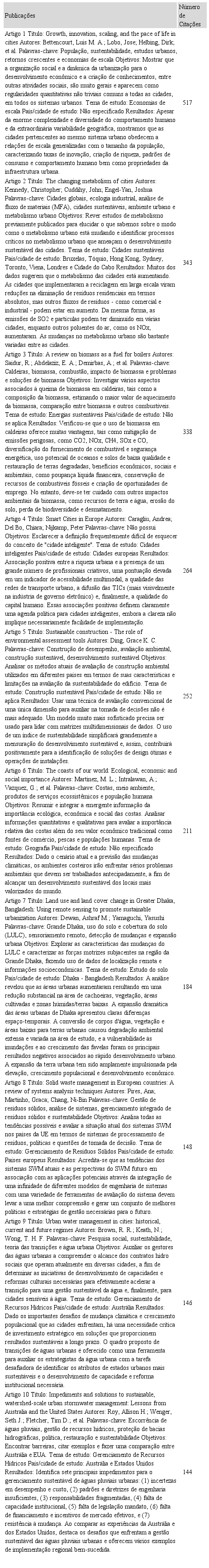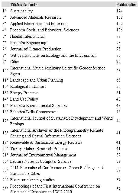 Tendo em vista que os artigos e os papers em anais são predominantes entre as publicações, torna-se importante destacar os títulos das principais fontes de estudos que abordam as temáticas ‘desenvolvimento sustentável’ e ‘urbano’. Assim, a Tabela 3 apresenta os nomes dos periódicos e anais de congressos com os maiores números de publicações nesta temática.