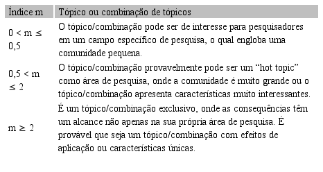 Realizou-se a análise do número de citações e o impacto destes estudos. Para tanto, utilizou-se o índice h-b e o índice m. O índice-h foi proposto por Hirsch (2005) como forma de caracterizar a produção científica de um pesquisador. Posteriormente, Banks (2006) sugeriu o índice h-b, uma extensão do índice h, obtido por meio do número de citações de um tópico (ou combinação de tópicos) em determinado período, listados em ordem decrescente. O índice h-b é expresso pelo número de publicações que obtiveram uma quantidade de citações igual ou maior à sua posição no ranking. O índice m, por sua vez, é calculado por meio da divisão do índice h-b pelo período de anos que se deseja obter informações (BANKS, 2006). De acordo com o autor, é realizada a seguinte classificação, pelo índice m, conforme exposto na Tabela 1, a seguir.
