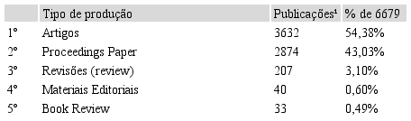 Ressalta-se que grande parte dos estudos são artigos publicados em periódicos, representando aproximadamente 55% destes, conforme evidenciado na Tabela 2. Destacam-se, ainda, os papers publicados em anais de congressos, com 43% dos documentos. Dessa maneira, pode-se afirmar que a maior parte destas publicações é considerada produção científica.