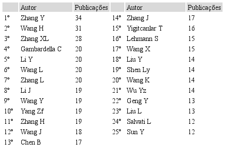 Foram analisados, ainda, os principais autores dos estudos nessas temáticas e a quantidade de publicações a eles associadas. Conforme descrito na Tabela 4, a seguir, os autores Y. Zhang, H. Wang e Z. L. Zhang se destacam entre aqueles que possuem maior produção nesta área. Pode-se ressaltar, ainda, uma pequena concentração da produção científica, na medida em que diversos autores figuram com quantidade relativamente equivalente de publicações.