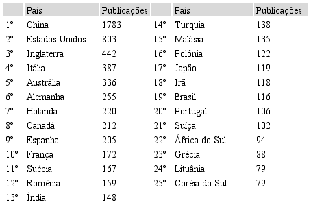 E, ao analisar a Tabela 5 e a Tabela 7, percebe-se que, apesar do Brasil se posicionar entre os 19 principais países com publicações nesta temática, nenhuma instituição de ensino ou pesquisa brasileira foi relacionada entre as 25 instituições em destaque.