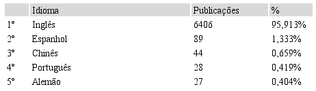 Destaca-se que, apesar da multiplicidade de países e da superioridade em número de publicações da China, existe predominância do idioma inglês nas publicações internacionais. Conforme apresentado na Tabela 6, aproximadamente 96% dos estudos listados na pesquisa são disponibilizados neste idioma.