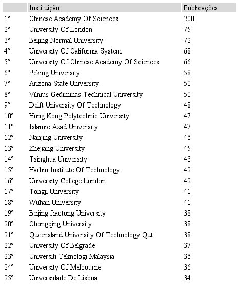 Os resultados da pesquisa mostram as principais instituições de acordo com o número de publicações que abordam as temáticas estudadas. De acordo com a Tabela 7, cabe ressaltar que a instituição predominante da produção científica relacionada a ‘desenvolvimento sustentável’ e ‘urbano’ é a Chinese Academy Of Sciences, evidência das diversas publicações oriundas do país.