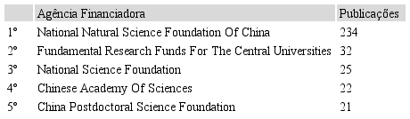 São apresentadas, ainda, nesse levantamento, as cinco agências financiadoras das pesquisas, na Tabela 8. Ressalta-se que 4 são chinesas e, além disso, que a National Natural Science Foundation Of China mostra grande superioridade de financiamento frente às demais agências. Posto isto, evidencia-se o grande investimento da China na pesquisa científica e, comprovadamente, neste tema de estudo.