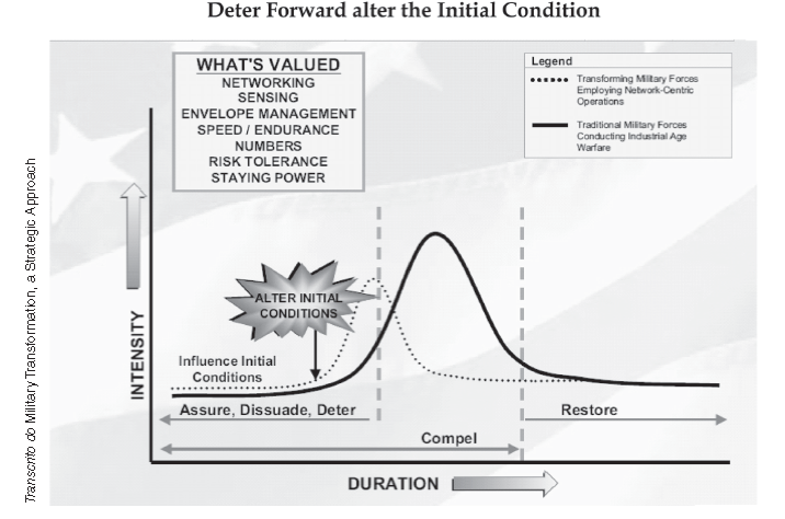 Em termos ilustrativos, uma Força Armada transformada atinge seu ponto máximo de intensidade mais cedo que uma força militar convencional, tornando-se mais curta e menos dispendiosa (COVARRUBIAS, op. cit.), conforme apontado na figura que segue.