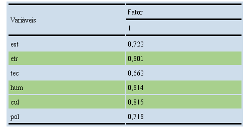 A validade da referida escala foi buscada, de forma a medir realmente desejado, buscando a validação interna por meio da equidade na aplicação do instrumento de pesquisa e a validação externa por meio da validade de conteúdo, também chamada de face validity, em que um especialista confirma a qualidade da pesquisa. Após a verificação da confiabilidade e da validade do construto, foi realizada a análise fatorial, surgindo apenas um fator que englobou todas as variáveis propostas, confirmando, estatisticamente, a hipótese H1 da investigação. Desta forma, foi possível agrupá-las em um único fator, denominado “transformação organizacional” - conforme demostrado na Tabela 1.