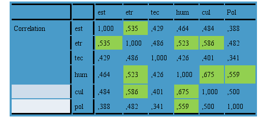 Realizada a análise fatorial, destacaram-se as seguintes perspectivas como de maior destaque: a cultural, a humana e a estrutural. Tal resultado indica que os respondentes identificam nestes três fatores os aspectos principais, que influenciam no processo de transformação organizacional. Esse aspecto ficou evidenciado na tabela de correlações, em que a perspectiva cultural possui um alto índice de correlação com as perspectivas humana e estrutural, destacando a importância do vetor Educação e Cultura.