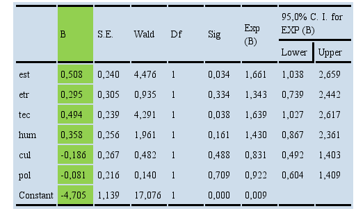 Como parâmetro para os questionamentos apresentados na pesquisa, foram consideradas as seis variáveis eleitas para definir o processo de transformação (MOTTA, op. cit.), sendo adotadas as respectivas abreviações no corpo do texto: estratégica (est), estrutural (etr), tecnológica (tec), humana (hum), cultural (cul) e política (pol). Em adição, foi incluída questão focada na percepção dos respondentes - oficiais do EB - sobre a condução do processo de transformação. Consequentemente, foi estabelecida, por meio da regressão logística, a relação entre as seis variáveis (estratégica, estrutural, tecnológica, humana, cultural e política) com a percepção positiva ou negativa acerca da condução do processo de transformação corrente.