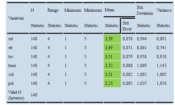 Por fim, foi estabelecida uma descrição estatística, com a finalidade de verificar os valores máximos e mínimos, a média e o desvio-padrão sobre o processo de transformação do EB, conforme tabela 04. A estatística descritiva demonstrou que não há consenso acerca da transformação organizacional em nenhum dos quesitos. Há, entretanto, tendência para a concordância, pois os valores da média são superiores a 3. Pode-se afirmar que os respondentes, prioritariamente, acreditam que as perspectivas eleitas, são relevantes para explicar a transformação organizacional do Exército Brasileiro.
