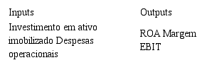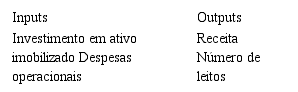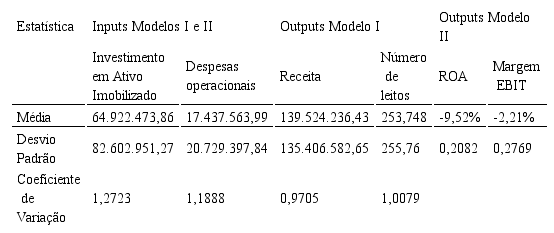 Já os outputs do Modelo I foram a “Receita” e o “Número de leitos”. Assim, este modelo destacará como eficientes os hospitais que conseguirem aumentar o número de leitos e a sua receita com o menor investimento em ativo imobilizado e menores gastos periódicos. Ademais, os outputs do Modelo II foram a “Margem EBIT” e o “ROA”. Neste modelo visou-se avaliar a eficiência dos hospitais em termos de lucratividade e rentabilidade, ou seja, serão considerados eficientes os hospitais que apresentarem os melhores resultados em relação aos investimentos operacionais e gastos periódicos.