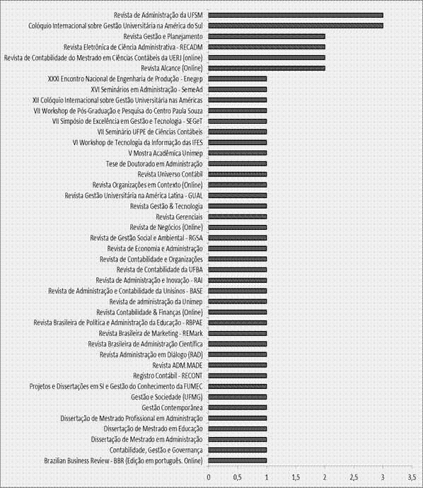 Pôde-se constatar que os 51 artigos e trabalhos da amostra estão dispersos em 43 veículos, sendo apenas aproximadamente 27,5% deles concentrados em seis periódicos e eventos (5,9% (03) na Revista de Administração da Universidade Federal de Santa Maria – UFSM, 5,9% (03) nos Colóquios Internacionais sobre Gestão Universitária na América do Sul, 3,92% (02) na Revista Gestão e Planejamento, 3,92% (02) na Revista Eletrônica de Ciência Administrativa – RECADM, 3,92% (02) na Revista de Contabilidade do Mestrado em Ciências Contábeis da UERJ e 3,92% (02) na Revista Alcance. Portanto, a maioria dos trabalhos importantes é publicada em diversas revistas e eventos não se observando, ainda, a presença da Lei de Bradford nesta temática, isto é, não há ainda um núcleo essencial de revistas que forma a base da literatura de GC em IESs.
