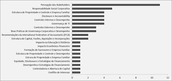 No que se refere aos principais temas discutidos nos artigos, constatou-se a predominância de estudos de governança nas IESs relacionados à percepção dos stakeholders, à responsabilidade social corporativa (RSC), às estruturas de propriedade e de controle e empresa familiar, à disclosure e accountability, aos controles internos e desempenho e à governança de TI, encontrando-se ainda trabalhos classificados em mais de um tema, abordando, por exemplo, ao mesmo tempo controles internos e desempenho e controles externos e desempenho, estrutura de propriedade e de controle e empresa familiar e formação de sucessores e empresa familiar, disclosure e accountability e equidade, disclosure e estratégias de financiamento. Muitos dos temas foram abordados apenas uma única vez, entre eles a interface GC versus impacto na Educação a Distância (EAD), sucessão em IESs familiares, estrutura de propriedade e de controle versus desempenho, conflitos de interesse, configurando-se como lacunas temáticas interessantes para pesquisas futuras.