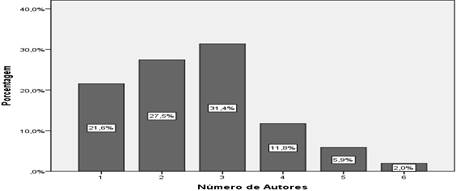 Os dados coletados revelam que os trabalhos e artigos publicados nos periódicos consultados (Figura 3) variam de um a seis autores. Nesta figura, verifica-se que os artigos envolvendo dois, três e quatro autores equivalem a 70,7% do total analisado, podendo ser um indicativo da existência de grupos de pesquisadores ou redes de pesquisa sobre a temática. Entretanto, artigos com um autor representam 21,6% do total. Essa informação sugere que os pesquisadores podem estar trabalhando sob um sistema de insulamento e individualidade, com poucas relações de intercâmbio e compartilhamento de experiência e conhecimentos entre si. Pela análise da estatística descritiva, é possível identificar que 3 (moda) é quantidade de autores que ocorre com maior frequência nos artigos publicados, e que eles foram escritos, em média, por 2,59 autores. Porém, o desvio padrão de 1,24 permite inferir que existe uma considerável dispersão da quantidade de autores em relação à sua média.