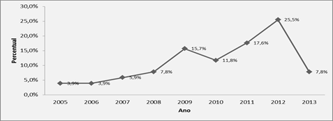 Para o desenvolvimento do estudo, delimitaram-se as publicações entre os anos de 2005 e 2013, sendo este último referente aos primeiros dez meses do ano. Verificou-se que houve pouca ocorrência de estudos relacionados ao tema nos anos de 2005 e 2006, isso pode ser em decorrência do surgimento apenas no início daquela década das primeiras iniciativas que marcaram a introdução das boas práticas de GC no Brasil. A distribuição foi crescente a partir do ano de 2007 até 2009, partindo de 5,9% (2007), passando por 7,8% (2008), alcançando 15,7% (2009). Em 2010, houve uma leve queda para 11,8%, atingindo o patamar máximo observado de 25,5% no ano de 2012 (Figura 4). Como a pesquisa foi realizada até o dia 08 de novembro de 2013, é bem provável que a quantidade de trabalhos que ainda foram produzidos no ano de 2013 não ultrapassou o total produzido no ano de 2012. A produção média, no período analisado, foi de 5,7 artigos e trabalhos publicados. Contudo, os dados estão espalhados por diversos valores, mostrando que há uma alta variação ou dispersão da quantidade produzida e publicada de artigos em torno da média, como pode ser comprovada com a identificação de um desvio padrão de 3,7.