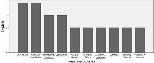 Verificou-se que os 51 trabalhos e artigos foram escritos por 131 autores. Os autores mais prolíficos envolvendo a interface GC em IES no período analisado são Annor da Silva Júnior e Emerson Wagner Mainardes, com 4 publicações, cada um, em eventos e periódicos B1 e B2; Maria José Carvalho de Souza Domingues e Reynaldo Maia Muniz, com 3 publicações também em revistas B1 e B2; e Antônio Carlos Giuliani, Eduardo Eugênio Spers, Fábio Vinicius de Macedo Bergamo, Felipe Zambaldi, Mateus Canniatti Ponchio e Priscilla de Oliveira Martins, com 2 publicações, cada um, em eventos e periódicos A2, B1 e B2.