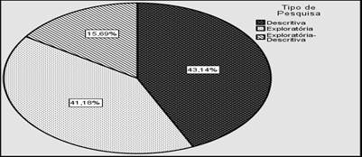 Sendo assim, ao analisar a Figura 6, verifica-se que as pesquisas descritivas são predominantes nos estudos de GC nas IES nos periódicos e demais fontes analisadas. Os dados coletados mostram que 43,1% dos artigos e trabalhos publicados foram descritivos; seguidos por estudos exploratórios, com 41,2%; e estudos exploratório-descritivos, com 15,7%, concentrando, assim, os tipos de pesquisa sobre governança corporativa em instituições de ensino superior.