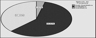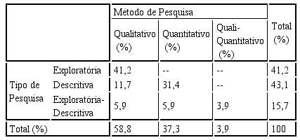 Relacionando o tipo de pesquisa com o método utilizado pelos autores, pode-se notar pela tabulação cruzada (Tabela 3) que dos 43,1% dos artigos e trabalhos descritivos publicados, a maioria (31,4%) utiliza o método de pesquisa quantitativo; todos os 41,2% de estudos exploratórios usam o método qualitativo; e dos 15,7% de estudos exploratório-descritivos, 5,9% utilizam o método qualitativo e esse mesmo percentual aplica-se também para o método quantitativo, seguidos de 3,9% que utiliza o método misto.
