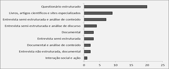 No que diz respeito aos instrumentos de coleta dos dados utilizados nos trabalhos e artigos pesquisados, a Figura 9 mostra a predominância de questionários estruturados, estando presente em 20 (39,2%) dos 51 trabalhos, tanto naqueles que fizeram estudo de caso quanto naqueles que adotaram estudos multicasos e survey como procedimento metodológico. A consulta em livros, artigos científicos e sites especializados apareceu em 9 (17,6%) trabalhos, que são puramente bibliográficos. A entrevista semiestruturada, se considerada de forma isolada, aparece em 14 (27,4%) trabalhos; se considerada em conjunto com a análise de conteúdo, aparece em 7 (13,7%) trabalhos, e com a análise de discurso, aparece em 4 (7,8%) trabalhos. Como técnica de análise dos dados, a análise de conteúdo e de discurso se consideradas de forma separada evidenciam-se em 13 (25,5%) trabalhos, o que, conseqüentemente, reitera a utilização de abordagens qualitativas pelos autores, conforme destacado na Figura 7.