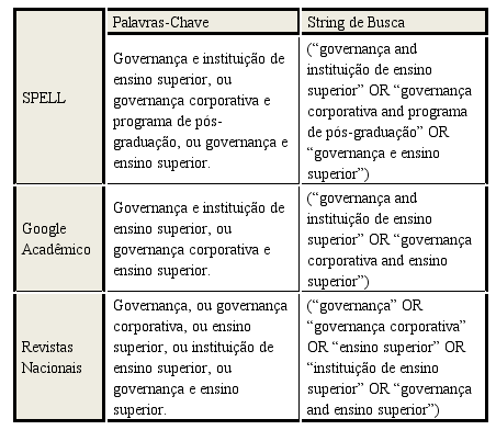 Os critérios e mecanismos utilizados no Google Acadêmico para a busca de trabalhos foram: (i) encontrar artigos com todas as palavras – governança ou governança corporativa; (ii) com no mínimo uma das palavras – instituição de ensino superior ou ensino superior; (iii) onde minhas palavras ocorrem – no título do artigo; (iv) período de publicação – entre 2005 e 2013; e (v) pesquisar na Web.