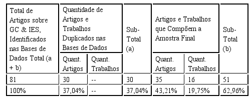Com o uso desses parâmetros para a seleção dos trabalhos, foi possível identificar um total de 27 artigos publicados no Google Acadêmico que abordavam o tema GC ou IES. Posteriormente à seleção dos trabalhos, foi efetuada uma leitura dos títulos, resumos, palavras-chave, metodologias e conclusões, buscando identificar aqueles que tratavam da interface entre GC e IES. Utilizando estes procedimentos, restaram apenas 19 trabalhos para a análise.