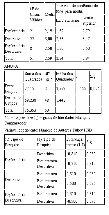 Esta tabela mostra que a soma dos quadrados para o teste entre grupos é 7,1 e para o teste dentro dos grupos é 69,24. Desta maneira, a análise mostra que F (2, 48) = 2,47, p > 0,05. Essa análise de variância do número de autores em relação ao tipo de pesquisa empregado mostrou que qualquer diferença entre as condições é provável de ter ocorrido apenas por erro de amostragem, considerando que a hipótese nula seja verdadeira. Também mostra que não existe uma diferença estatisticamente significativa entre as médias dos grupos de pesquisas exploratórias e as dos grupos de pesquisas descritivas em relação ao número de autores. Do mesmo modo, também não existem diferenças estatisticamente significativas entre as médias dos grupos de pesquisas exploratórias e as dos de pesquisas exploratório-descritivas, bem como entre as pesquisas descritivas e as exploratório-descritivas.