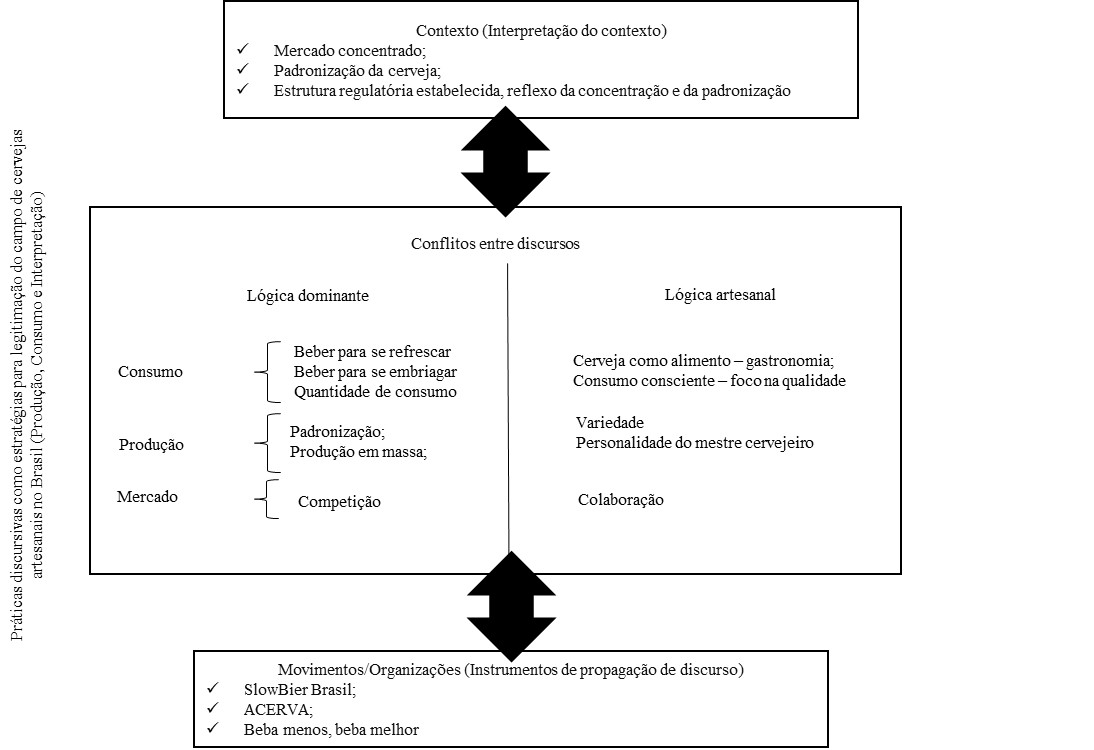 A Figura 1 apresenta uma síntese dos resultados, considerando: (1) a interpretação dos agentes sobre o contexto; (2) os discursos emergentes do segmento de cervejas artesanais para consumo, produção e mercado, bem como os conflitos com a lógica dominante para cervejas no Brasil; e (3) os movimentos e organizações destinados à propagação de discursos gerados no segmento de cervejas artesanais.
