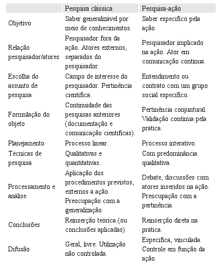 Alguns autores tratam das especificidades da pesquisa-ação, ressaltando o seu papel no cumprimento de objetivos sociais. Thiollent (1994) analisa que a pesquisa-ação e a pesquisa participante são frequentemente tidas como sinônimos, o que sugere não ser correto, pois a primeira supõe uma forma de ação planejada de caráter social, educacional, técnica e baseia-se na participação, o que nem sempre é encontrado nas propostas da segunda, embora as duas sejam alternativas ao padrão de pesquisa tradicional. Dionne (2007, p. 76) segue a mesma ideia ao destacar que os objetivos da pesquisa-ação, enquanto instrumento de intervenção na realidade, são diferentes dos da pesquisa clássica, pois visam a “uma mudança a realizar, uma situação a modificar”. Isso implica o fato de que não se possa, geralmente, definir leis universais de explicação, o que é um dos principais aspectos que caracteriza a pesquisa-ação como antipositivista. É importante que se observem as diferenças entre pesquisa-ação e pesquisa clássica, sistematizadas e comparadas por Dionne (2007):