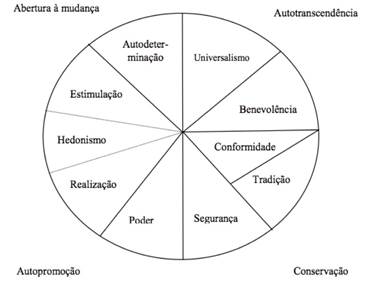 A Teoria de Valores Pessoais de Schwartz (1994, 1992) especifica um conjunto de valores de ordem superior e de ordem inferior. Os 10 valores de ordem inferior formam os 4 valores de ordem superior, os quais estão organizados em uma estrutura circular de duas dimensões bipolares. Em uma dimensão estão os valores “Abertura à mudança” versus “Conservação”, os quais, segunda a teoria, possuem uma relação de oposição. Na outra dimensão estão os valores “Autopromoção” versus “Autotranscendência” (Figura 1).