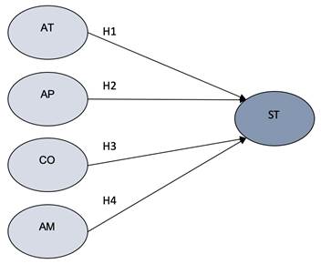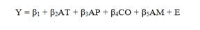 Nesta regressão, a variável dependente (Y) diz respeito à Satisfação com o Trabalho (ST); e as variáveis independentes referem-se, respectivamente, aos 4 valores pessoais: Autotranscedência (AT), Autopromoção (AP), Conservação (CO), e Abertura à Mudança (AM). Para melhor entendimento da estrutura do modelo testado neste estudo, segue o desenho do modelo com as devidas variáveis e hipóteses de pesquisa.