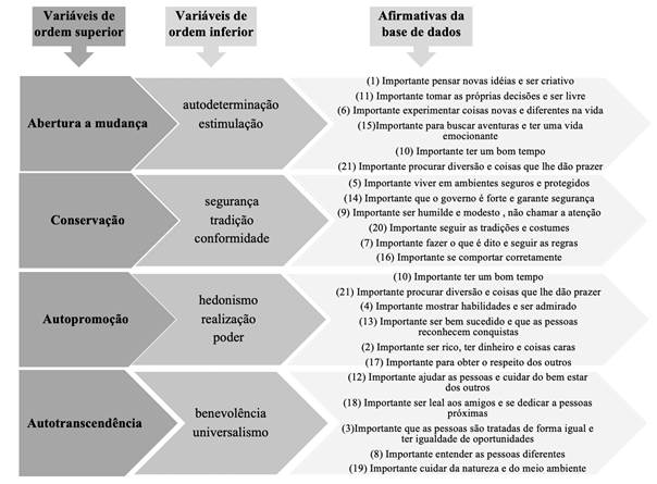 Neste estudo, as 21 variáveis foram agrupadas diretamente nos 4 valores de ordem superior (abertura à mudança, conservação, autopromoção e autotranscendência), pois o objetivo foi trabalhar com estes valores e não os de ordem inferior. A construção dessas variáveis se deu com base na teoria (Schwartz, 1992, 1994), a partir do software SPSS, por meio do cálculo das médias das respostas de cada uma das 21 afirmativas encontradas na base de dados. Na Figura 2 é demonstrado um esquema com a composição das variáveis de forma facilitar o entendimento. Portanto, a Abertura à mudança foi formada a partir da média das variáveis (1) autodeterminação, (2) estimulação e (3) hedonismo. A Conservação, de (6) conformidade, (7) tradição e (8) segurança. A Autopromoção, de (3) hedonismo, (4) realização e (5) poder. Por fim, a Autotranscendência, a partir da média de (9) Universalismo e (10) benevolência.