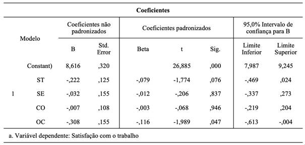 O modelo deste estudo considerou exclusivamente os valores pessoais de Schwartz como variáveis independentes, e a “satisfação com o trabalho” como variável dependente. A análise dos resultados mostrou que o coeficiente de correlação R do modelo revelou uma correlação positiva, fraca (0,179) e significativa ao nível de 5%; e o coeficiente de determinação (R²) revelou que 3,2% da variância total da satisfação no trabalho é explicada pelo modelo; portanto os 97% restantes dessa variação são explicadas por outros fatores, notando-se, assim, a necessidade de incluir mais variáveis explicativas ao modelo.