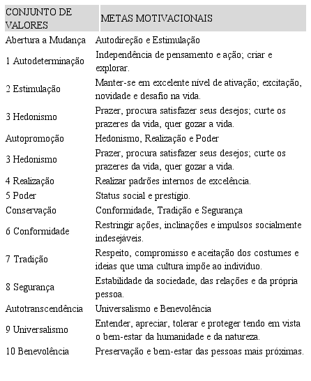 Para melhor entendimento, no Quadro 1 o conjunto dos 10 valores de ordem inferior estão distribuídos entre os 4 valores de ordem superior com a descrição de suas metas motivacionais as quais orientam os indivíduos ao longe de suas vidas. Ressalta-se que, conforme se pode observar a partir da linha tracejada na estrutura dos valores (Figura 1), o valor de ordem inferior “Hedonismo” é compartilhado com a Autropromoção e a Abertura à Mudança e, portanto, nesta pesquisa, foi considerado como variável que constrói cada um desses fatores.