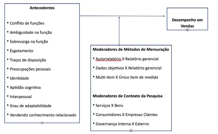 No ano de 2011, os autores Verbeke, Dietz e Verwaal realizaram uma meta-análise com base nos estudos de Walker, Churchil e Ford (1977), mas esta meta-analise abordava o período contemporâneo de 1982 a 2008. Nela, Verbeke, Dietz e Verwaal (2011) estimaram a validade preditiva de suas subcategorias e o impacto de uma série de moderadores de relações determinantes de venda-desempenho. Os resultados encontrados apontaram duas questões relevantes. A primiera são cinco subcategorias que demonstraram relações significativas relacionando o desempenho e vendas, sendo a venda relacionada com o conhecimento, o grau de adaptabilidade, as ambiguidades de funções (ou seja, os papeis), a aptidão cognitiva e o engajamento no trabalho. Já a segunda questão encontrada é em relação às subcategorias moderadas pelo método de medição, contexto de pesquisa e variáveis do tipo de venda. Como resultado, foram interpretados os significados destes direcionadores de desempenho de vendas. A seguir, a figura 1 ilustra o modelo que foi proposto pelos autores.