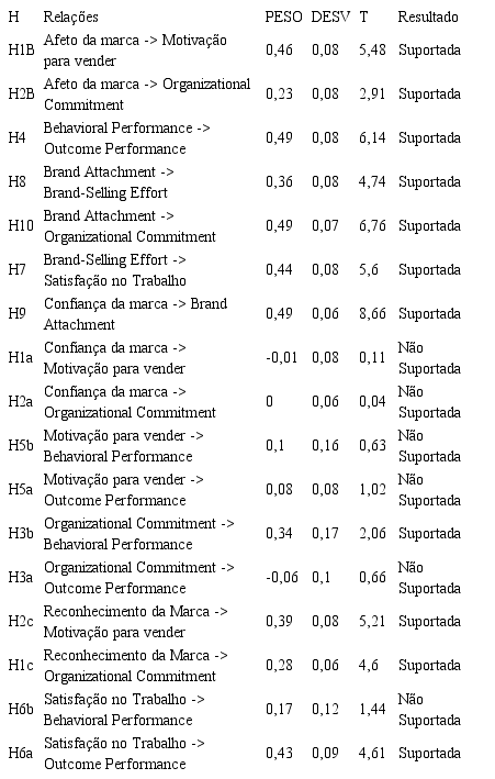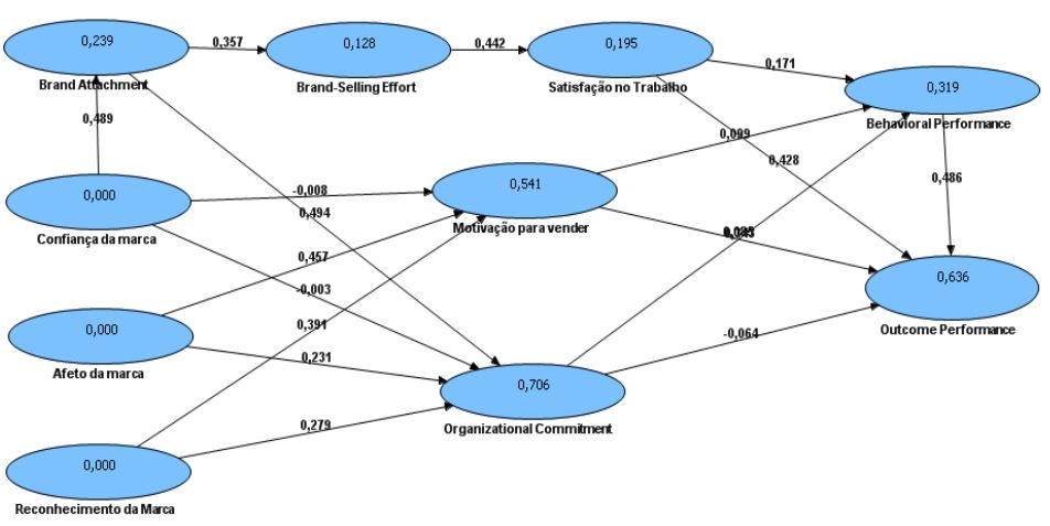 Com relação às conexões entre SBR e SBA, observa-se que a confiança na marca apresenta um impacto significativo com o apego, sendo (β=0,489, p<0,01). Seguindo a cadeia monológica do SBA, observa-se um impacto positivo do apego em relação ao esforço de vendas, sendo (β=0,357, p<0,01). Isto significa que quando um vendedor tem um forte apego à marca, aumenta o esforço de vendas. Este resultado encontrado confirma com os da pesquisa dos autores Gillespie e Noble (2017).