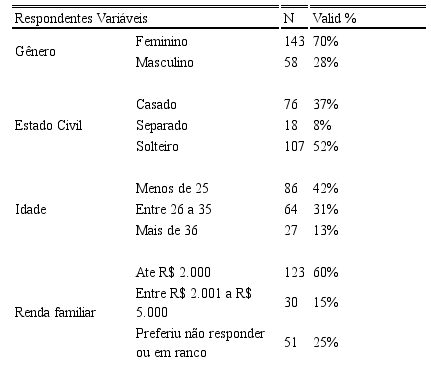 Quando da avaliação dos dados ausentes, isto é, dados incompletos nos questionários, observou-se uma quantidade pequena (0,76% da base), sendo que nenhuma variável apresentou mais que 5% de dados ausentes. Nenhum caso apresentou um número expressivo de dados ausentes (superior a 10%). Deste modo, para as escalas preferiu-se dar o tratamento de reposição dos dados pelo método da regressão linear simples (TABACHNICK e FIDELL, 2007). Já para avaliar os outliers univariados foram aplicados dois critérios de classificação fora dos limites de 3,00 desvios em relação à média. Para identificar os casos com combinações de valores fora dos padrões denominados de outliers multivariados, empregou-se a distância de Mahalanobis (D2) Foram detectados 4 outliers multivariados. Deste modo, preferiu-se manter os casos univariados e multivariados, dado que em uma escala de 0 a 10, acredita-se que seu efeito sobre as estimativas seria mínimo, conforme comparação feita no teste do modelo (HAIR et al., 2010).