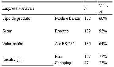 Quanto ao perfil da amostra das empresas, 77% são lojas localizadas nas ruas ou galerias. 93% delas trabalham com vendas de produtos físicos (não serviço). Mais de 60% destes varejos vendem produtos ligados à moda e à beleza. 64% dos estabelecimentos entrevistados possuem um valor médio dos produtos vendidos de R$ 256,00.