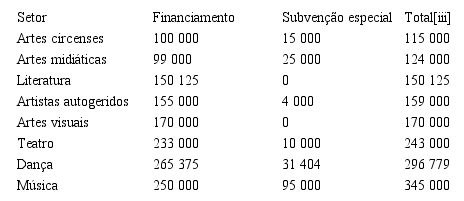 Considerada como principal lócus mundial da cadeia de produção circense, a cidade de Montréal gera mais de 4000 empregos diretos nesse setor e, na província de Quebeque, são 15 organizações que disponibilizam atividades circenses, 127 difusores das artes e 100.000 crianças/jovens “fazendo circo” (SAIRE; DALGIE, 2012). Entretanto, esse não é o setor com maior investimento financeiro do governo, principal via de fomento às artes no Canadá, como pode ser observado no quadro 1, em que são apresentados dados referentes à demanda de subvenções por setor artístico canadense (coluna 1), a quantidade em dólares canadenses de subvenções disponibilizadas pelo CALQ para cada setor do campo das artes que foi financiado pelo referido órgão (coluna 2), a quantidade, em dólares canadenses, de subvenções especiais liberadas pela CALQ no ano de 2011 para os artistas (coluna 3) e o total de subvenções da CALQ para as organizações artísticas canadenses entre os ano de 2010 e 2011.