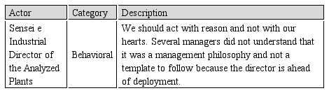 The interview with Sensei showed that he is disappointed with the performance of the other managers of the organization in the implementation of the program in the company. For the interviewee, in the background of an effective implementation should be considered a behavioral category of the participants in the process. Thus, it goes through an understanding of the lean manufacturing and the training of the people for the application and change of the form of management.