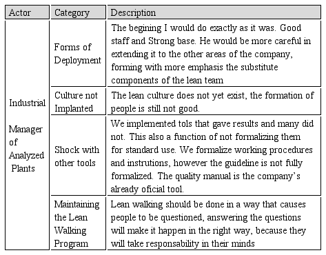 The data collection instrument of the research was thus applied to such informants, and the answers provided by them were now confronted with the existing literature and with available documents. Thus, interviews conducted in the second half of 2014 with thirteen managers from different hierarchical levels of the organization allowed highlighting points that served as element of construction of the categories of analysis of the implementation of lean manufacturing design.