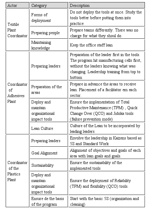 In the textile plant, the coordinator emphasized three categories: forms of implantation, preparation of the people and maintenance of knowledge. In terms of implementation, the concern corroborates that described in Womack and Jones (2004), which suggest starting with the need, identifying what is the crisis or the priority of the business. The more relevant the initial problem addressed, the more momentum the deployment has. People's preparation, which emerged category, refers to deployment delegation to coordinators or production management and reinforces the vision of tools and not as a system. The maintenance of knowledge is due to the fact that there were rapid modifications of the initial deployment team. This observation reinforces that constant command change and multiplicity of strategic initiatives, sometimes conflicting with each other, are relevant to the deployment (SMALLEY, 2004; NISHIDA, 2014).