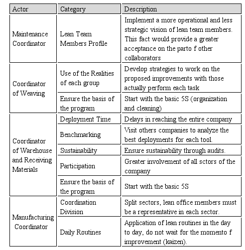 The manufacturing coordinator had less than six months in the company and was still becoming familiar with the deployment. The categories express the need for support of the understanding, suggesting the decentralization of the implementation and daily execution routines with punctual corrections. The same questions were asked to members of the lean office. The categories surveyed are presented in Table 6.