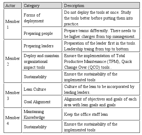 Table 6 ratifies the previous analyzes, repeating the categories and allowing to infer the same concerns of the other leaders occur and a concern with the progress and the learning verified throughout the implantation. Lean team members demonstrated that they were trained in the different tools and came to understand the form and the concepts. They believe that many of these concepts conflicted with the ideas of the company as a whole and made it difficult to implement because there was no alignment of the areas focused on the same objectives, which is explained in Nishida (2014). They reported that there were kaizens quantity targets to be realized, which impaired the analysis of the real needs identified in the value stream mappings.