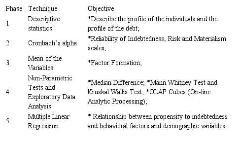 Regarding the techniques of data analysis, we chose descriptive statistics and multivariate analysis techniques, for which SPSS Statistics 20.0® software was used. Table 1 summarizes the research phases and data analysis techniques used.
