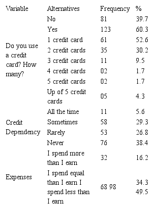 After the knowledge of the sociodemographic profile of the respondents, we analyzed the use of credit and the debt aspect, with 5 questions related to the use of credit card and expenses proposed by Disney and Gathergood (2011). Table 2 shows the profile of income and expenses of the respondents.
